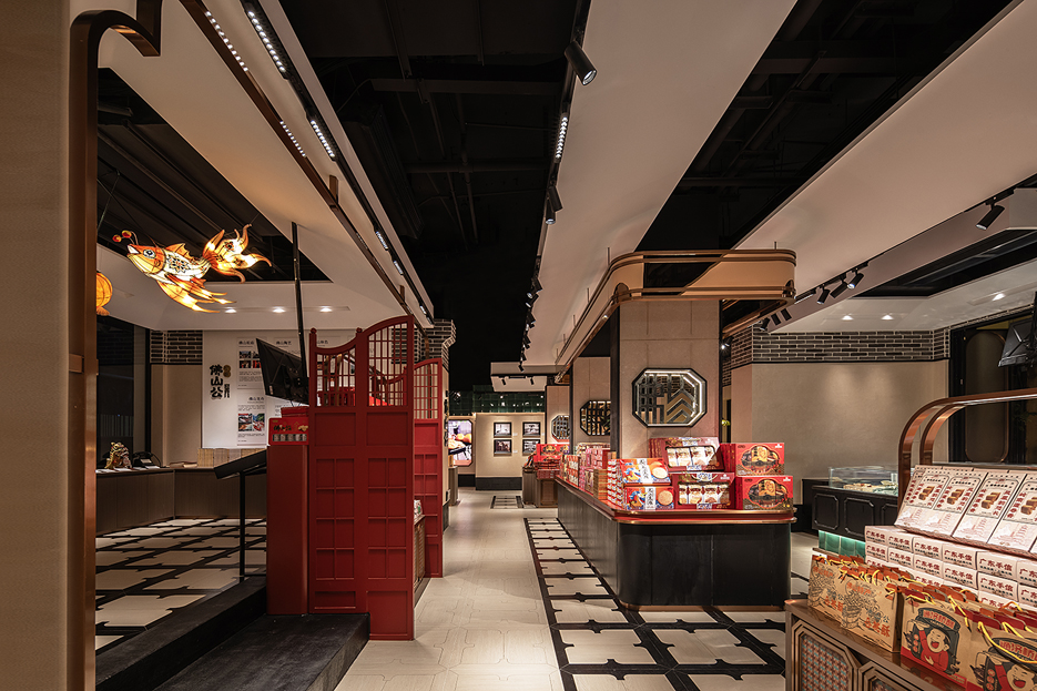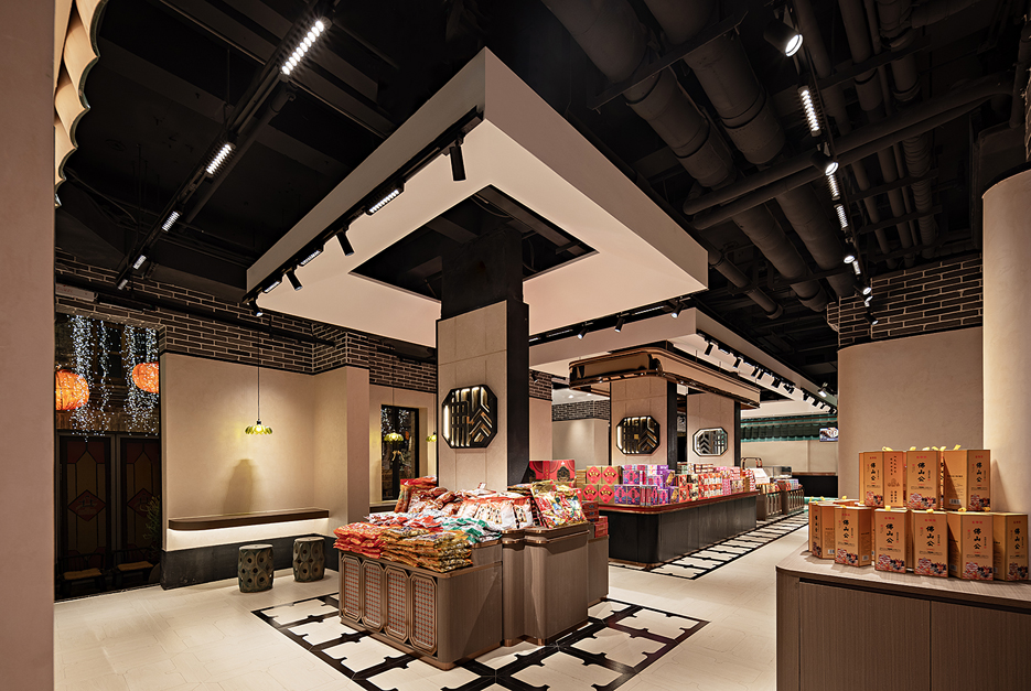 ·以传统“佛山公”文字轮廓为灵感设计形象符号,搭配仿青砖墙面与暖色基调,陈列佛山特产引入零售区主题——佛山印象;